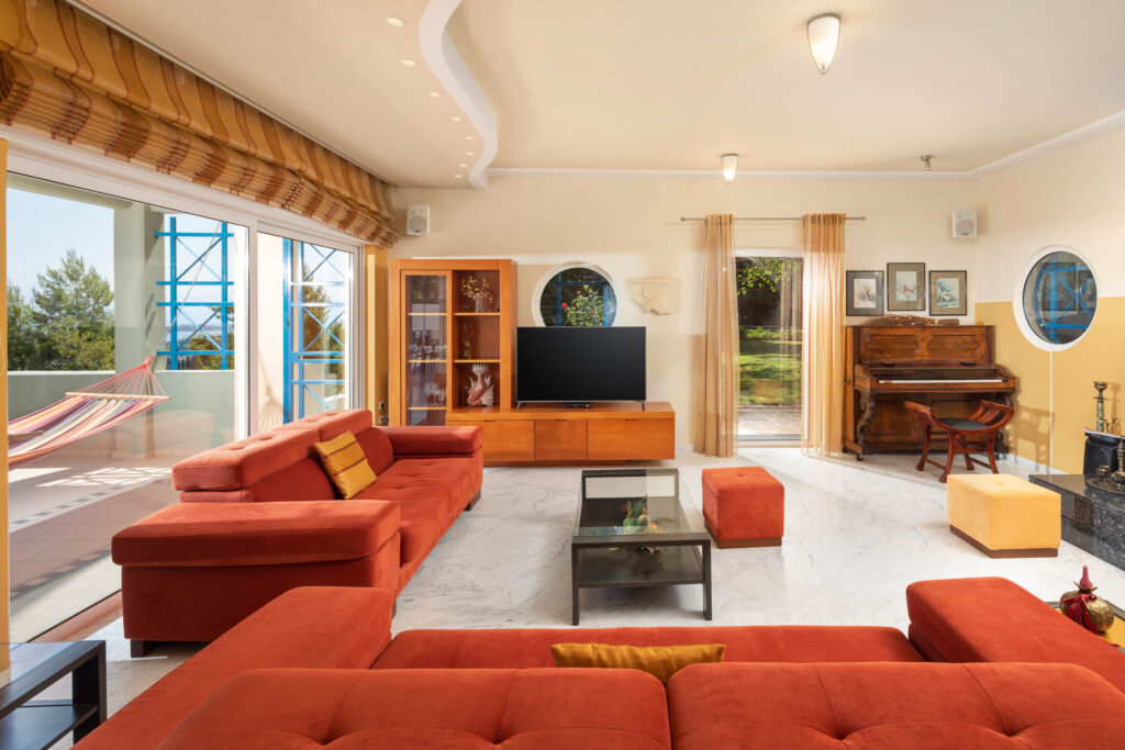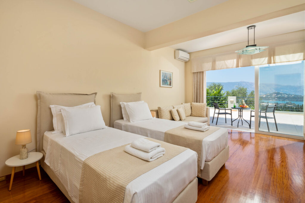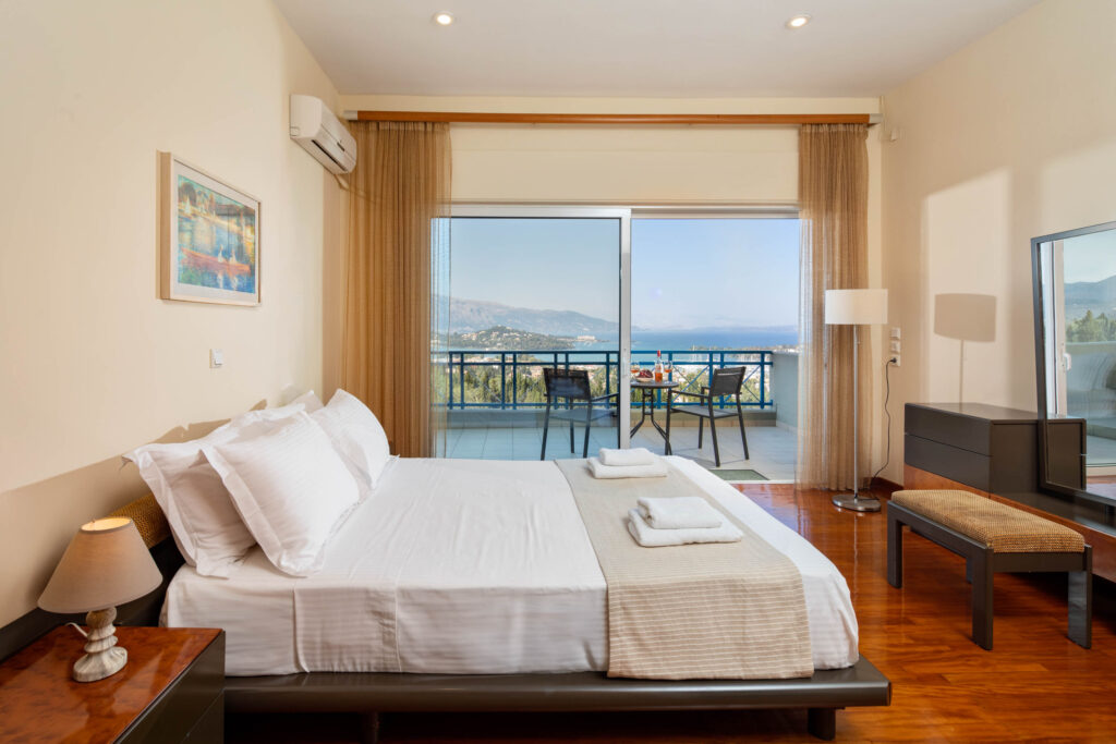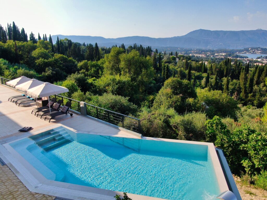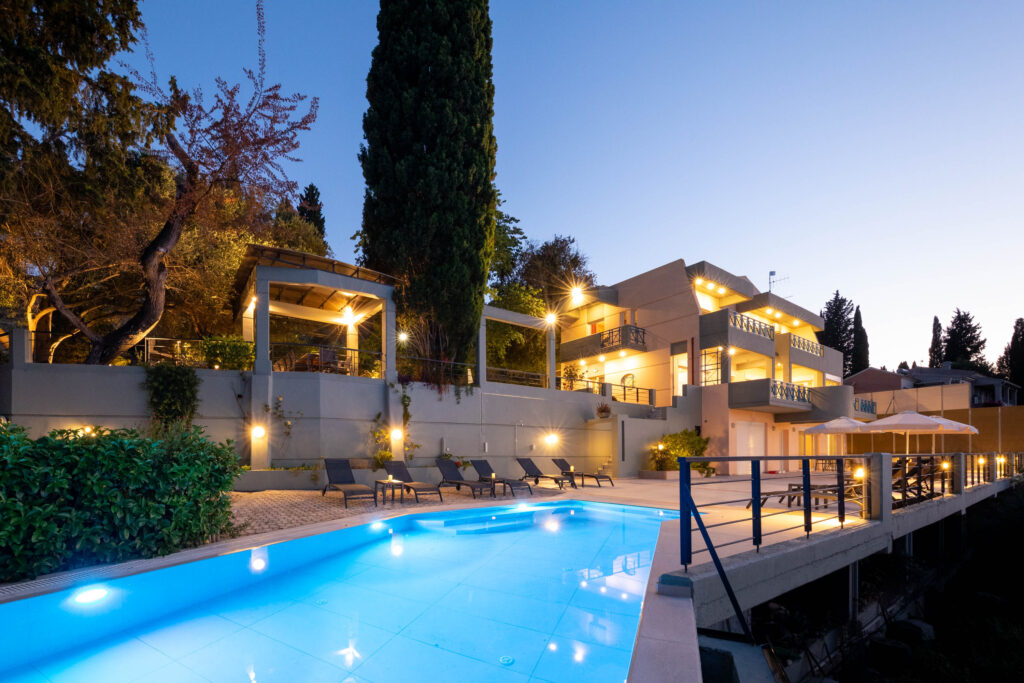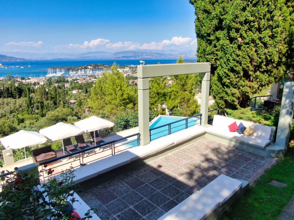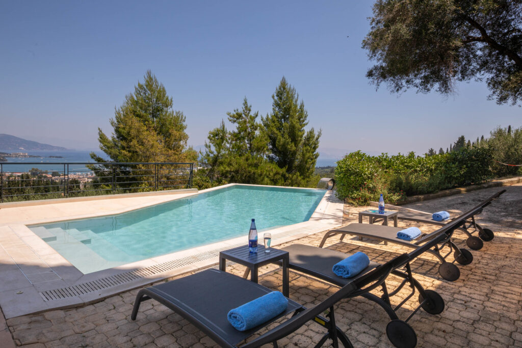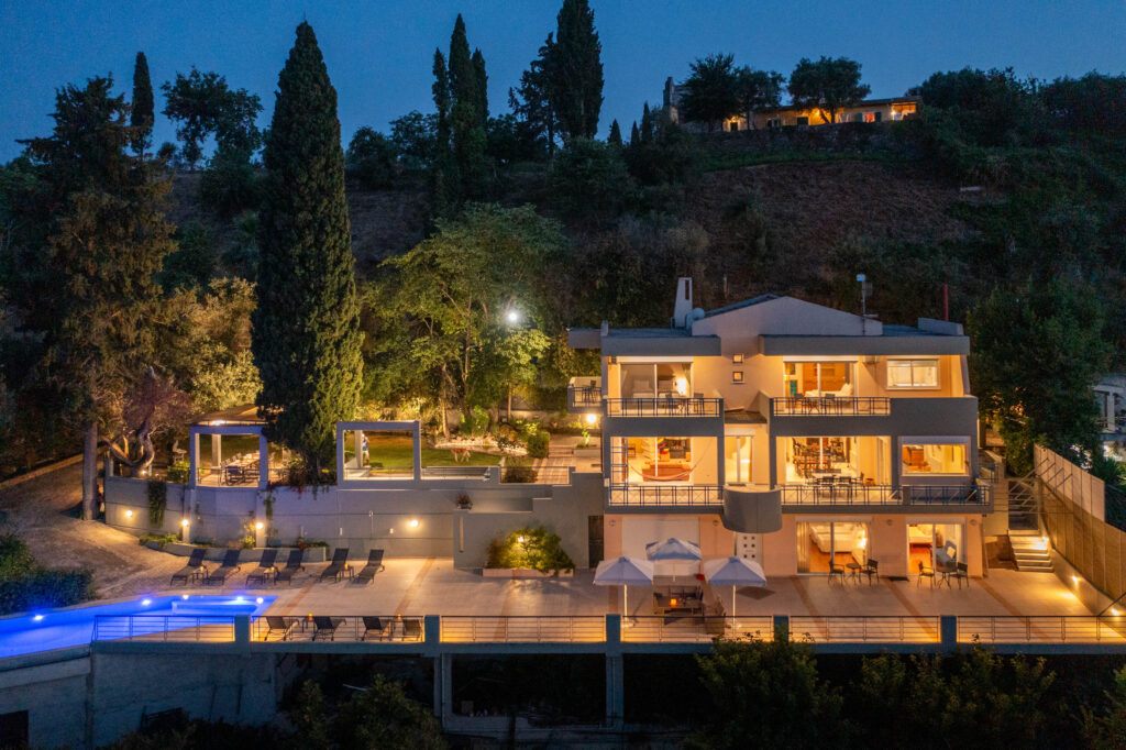 Villa Julie Christie is located in the center and east of the island. It is built on the slope and almost at the top of a hill, 15 minutes from the center of Corfu town and 3 minutes from the Marina of Gouvia. It is an exceptional luxury secluded hideaway that offers relaxation and privacy but is also the ideal starting point to explore the unique nature of Corfu and discover the island’s beaches. The variety of rooms covers all the needs and wishes of the guests.